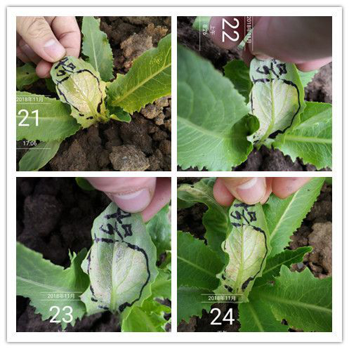 11月21日,云南省宜良县南阳镇示范试验,一天后病斑开始变黄,三天后病斑霉层完全脱落,病斑变干。